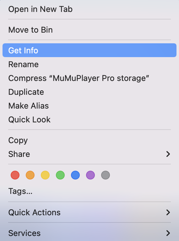 (2)Open the Info window, Unfold the "Sharing & Permission", and then Enable "Read & Write" permissions for the user currently using MuMuPlayer Pro.