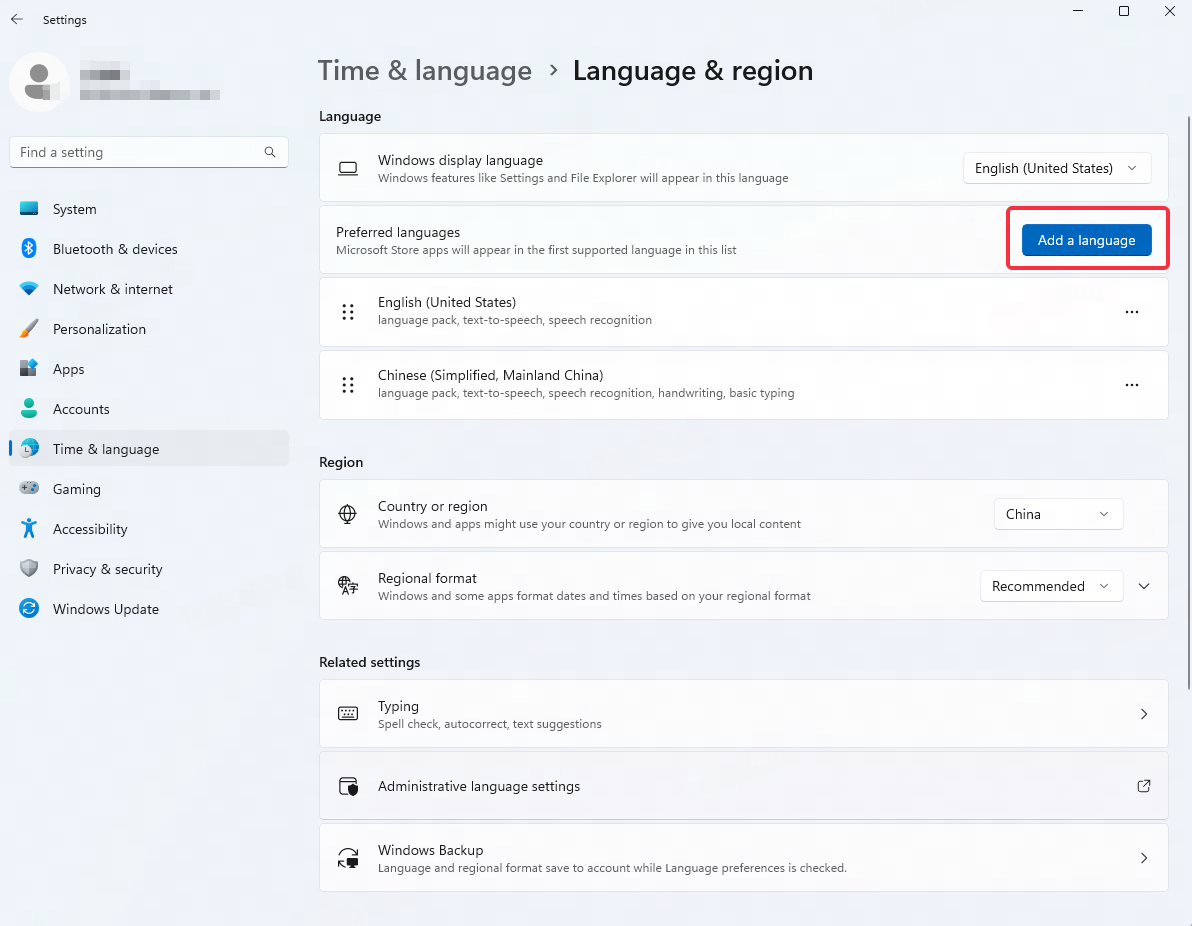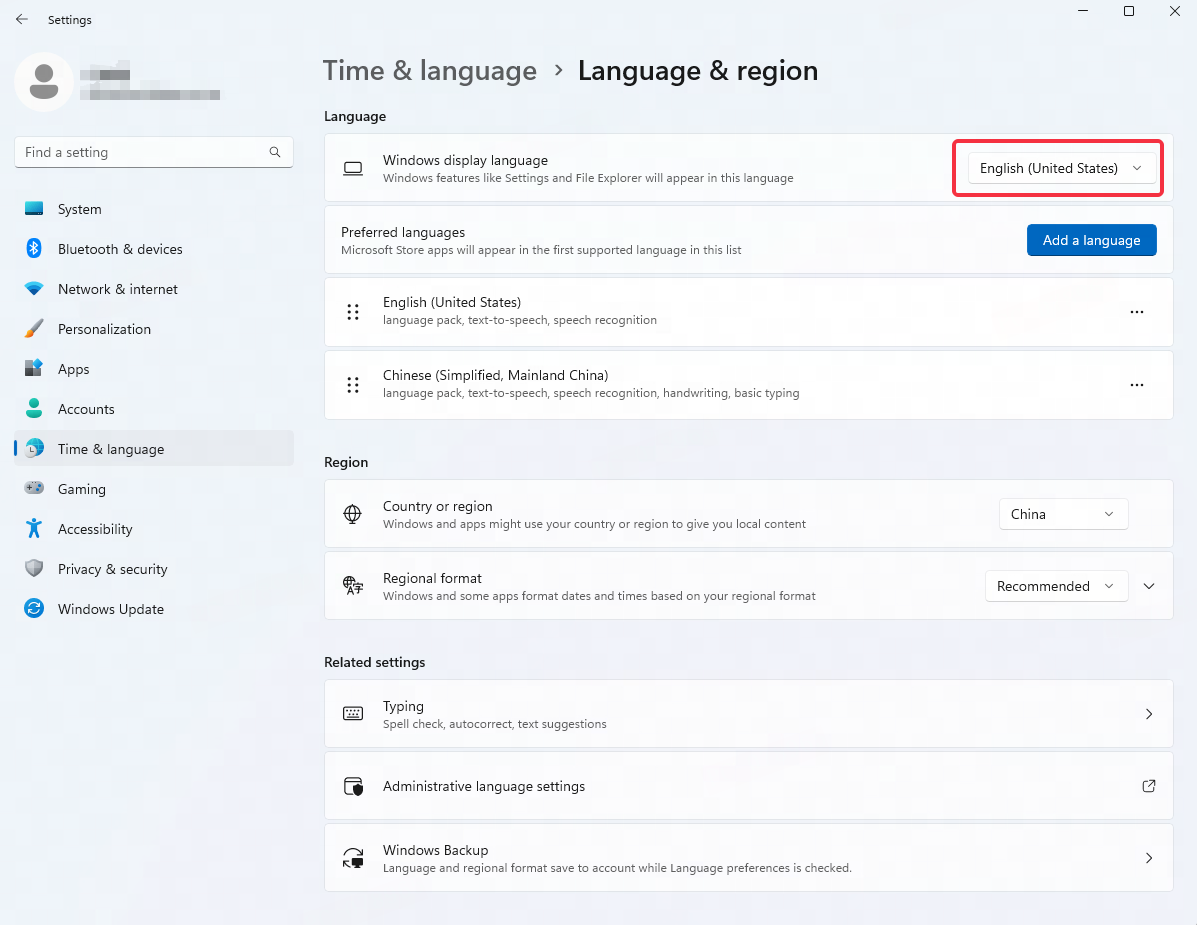 2. In the Time & language > Language & region window, under the Language section, click Add a language if you don't get the language you wanted on you PC. And then select the desired Windows display language in the drop-down menu next to Windows display language.