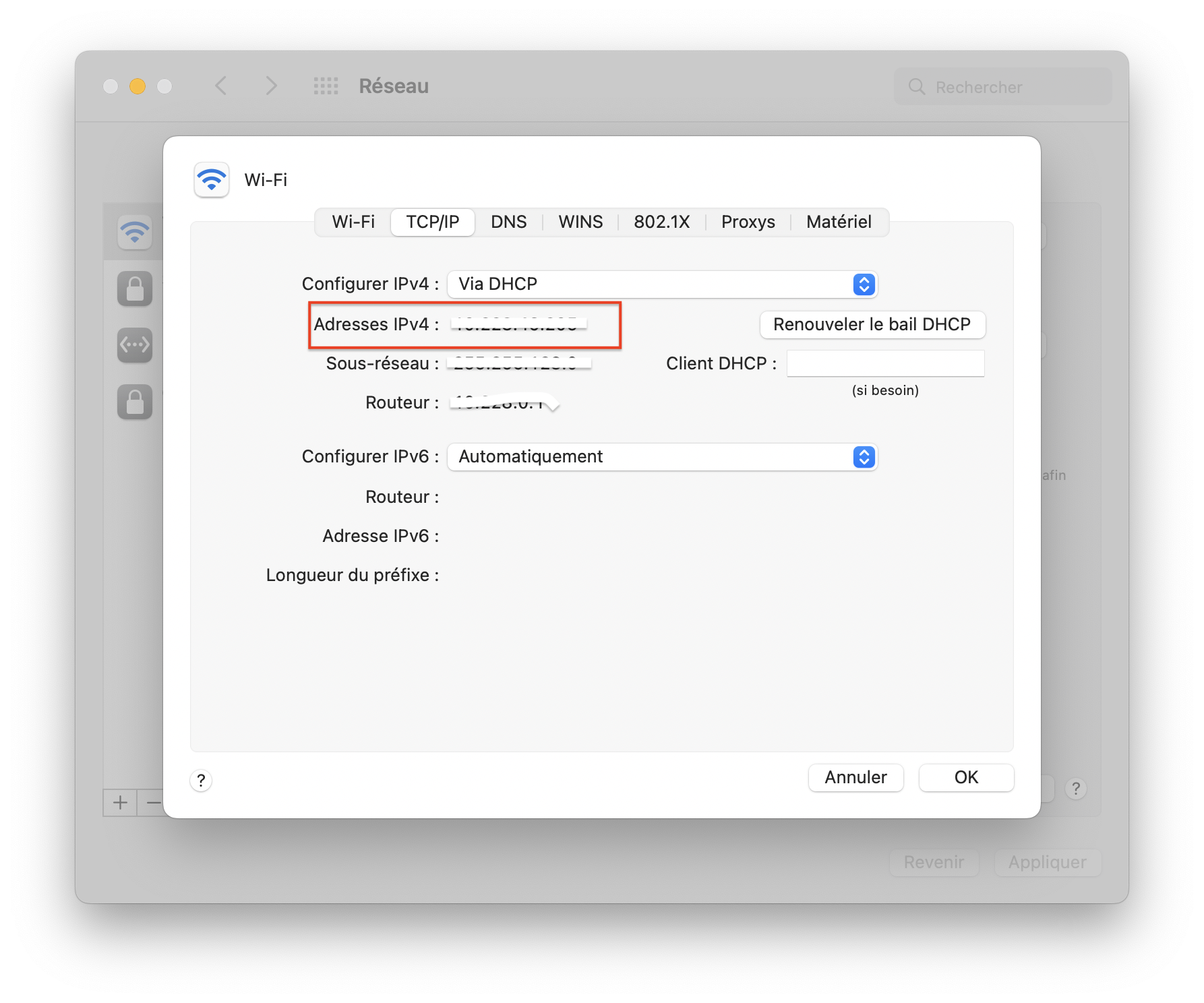 1. Trouvez l'adresse IP de l'appareil où vous avez installé MuMuPlayer Pro. Pour cela, ouvrez « Paramètres-Réseau » sur votre Mac. puis cliquez sur « Avancé... ». Ensuite, vous pouvez voir l'adresse IP sous Adresse IPv4, par exemple, 10.228.127.155.