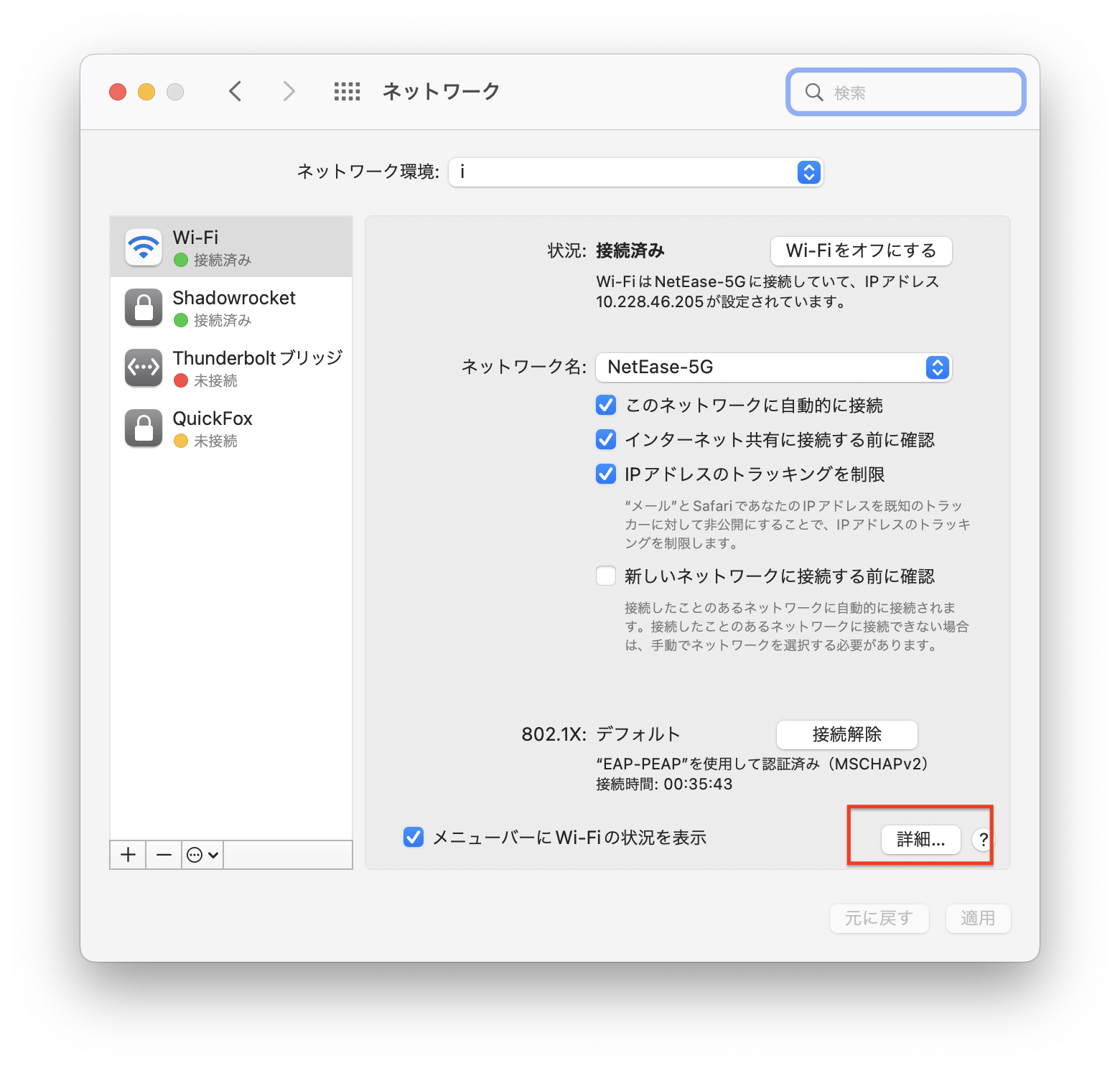 1.MuMuPlayer Proをインストールした端末のIPアドレスを確認します。Macシステム設定を開き、「ネットワーク」を検索した後、接続したネットワークの「詳細情報」をクリックすると、IPアドレスを確認できます。例えば、10.228.127.155など。