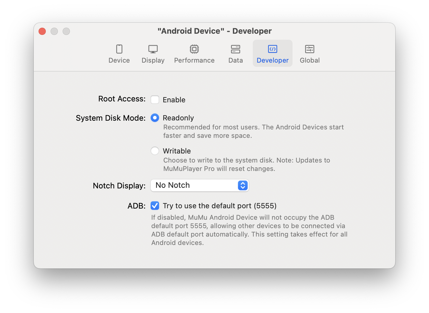4. ADB: Use ADB default port (5555) is ticked by default. When enabled, devices other than MuMu Android devices can automatically connect via the ADB default port. This option is a global setting and takes effect for all MuMu Android devices.