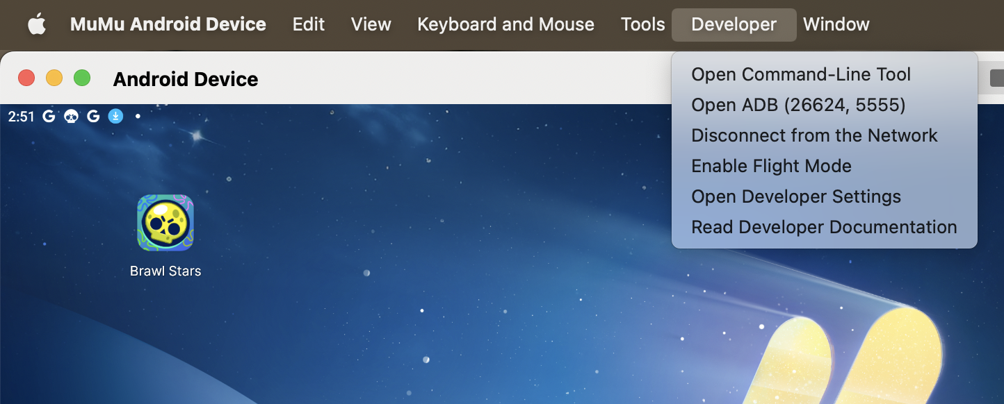 MuMuPlayer Pro can assist developers in application development and debugging. We currently supports managing the Android Device through Command-Line Tool, connecting to Android devices via ADB, and conveniently modifying network connection and flight mode status, etc. You can refer to the following documentation to make the most of the MuMuPlayer Pro! (Note: Please update to version 1.5.4 above to use.)