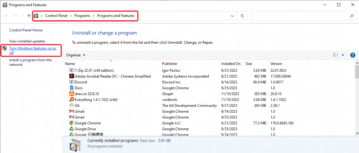 Step 2: click "Turn Windows features on or off";