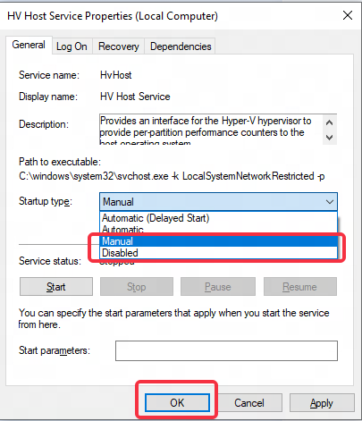 Step 2: double click "HV Host Service", change the Startup type into "Manual" or "Disable", then click "OK".