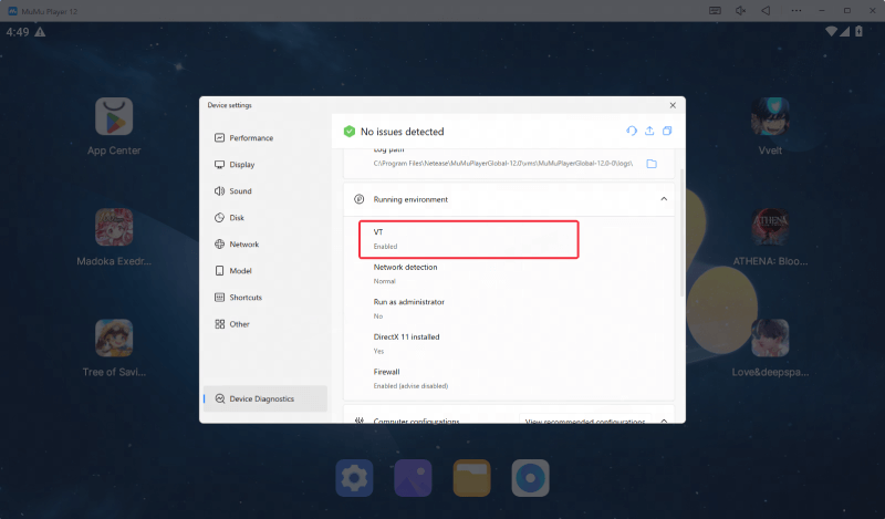 To check whether your PC supports VT, go to "Main Menu" at the upper right corner of the emulator → select "Device Diagnostics", then check the contents in the red box as shown below. If it says "Not supported", then you should upgrade your motherboard;
