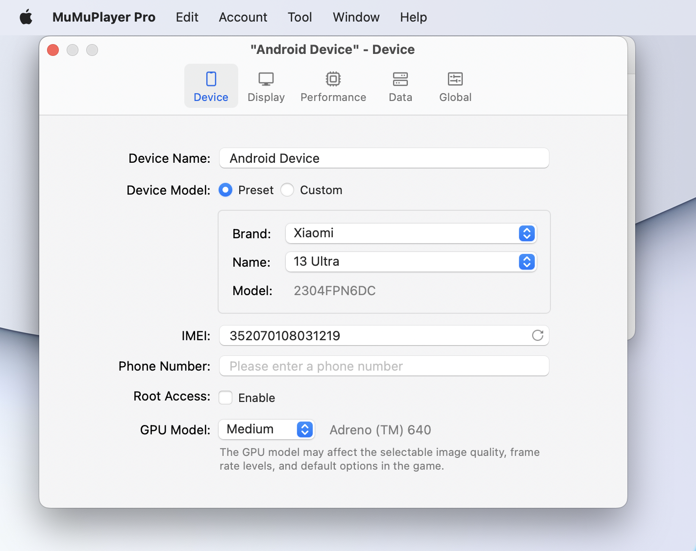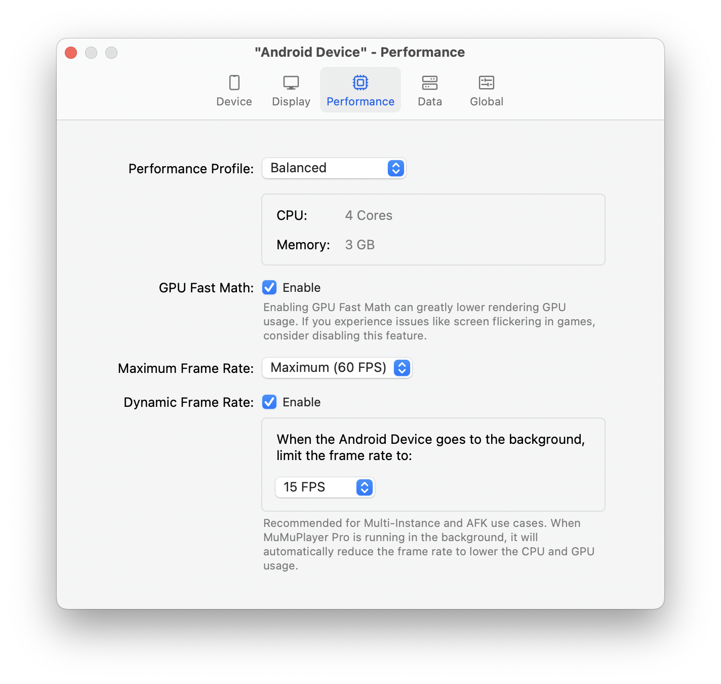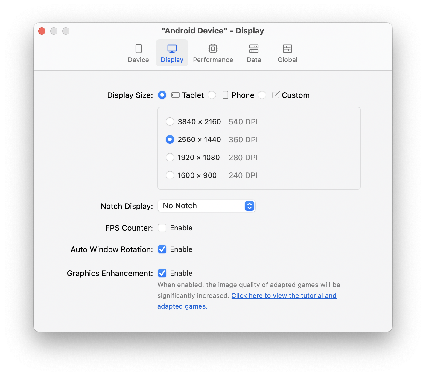 You can also modify device settings as needed, including aspects such as the device, display, performance, data and global.