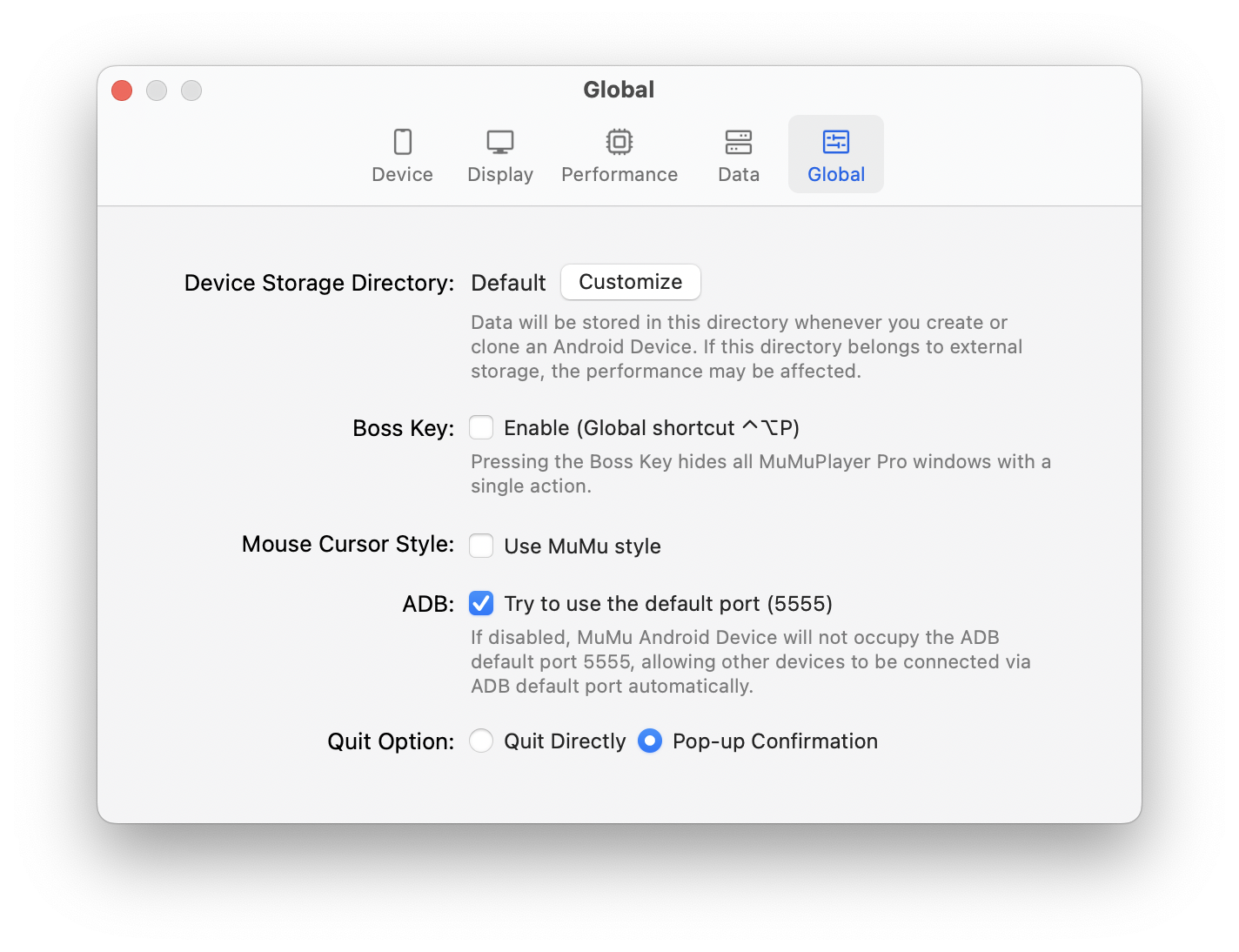 ⑤ Quit Option: When closing the Android device window using the 'X' in the top left corner, a secondary confirmation popup will appear by default to prevent accidental closure. To disable this secondary confirmation popup, you can change "Pop-up Confirmation" to "Quit Directly".