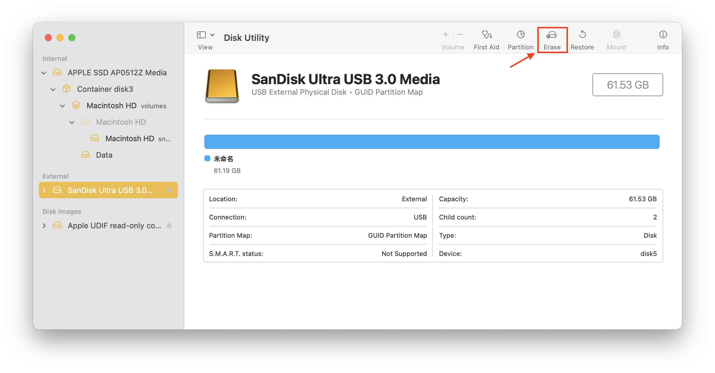 (3)Find the external hard drive that stores your Android Device and click on "Erase" on the upper right corner.