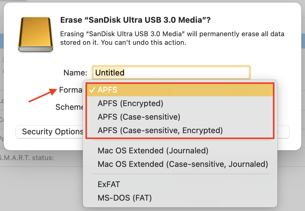 (5)Then click on "Format" and choose one of the options under the category of APFS.