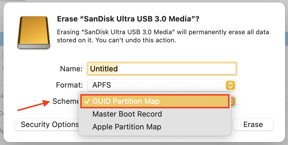 (4)After opening the confirmation pop-up window, choose "GUID Partition Map" in "Scheme".