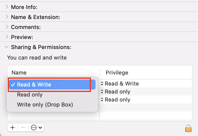 (2)Open the Info window, Unfold the "Sharing & Permission", and then Enable "Read & Write" permissions for the user currently using MuMuPlayer Pro.