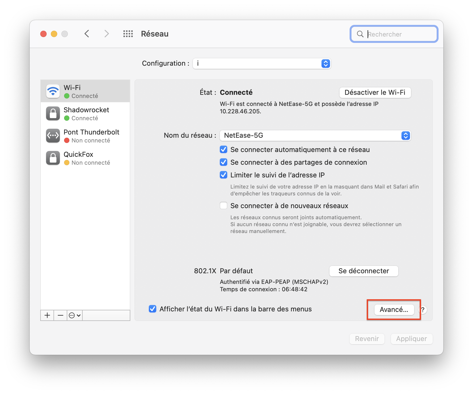 1. Trouvez l'adresse IP de l'appareil où vous avez installé MuMuPlayer Pro. Pour cela, ouvrez « Paramètres-Réseau » sur votre Mac. puis cliquez sur « Avancé... ». Ensuite, vous pouvez voir l'adresse IP sous Adresse IPv4, par exemple, 10.228.127.155.