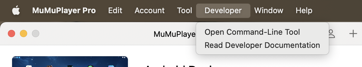 Open MuMuPlayer Pro and click on "Developer" to find "Open Command-Line Tool" for controlling MuMuPlayer Pro and multiple Android devices.