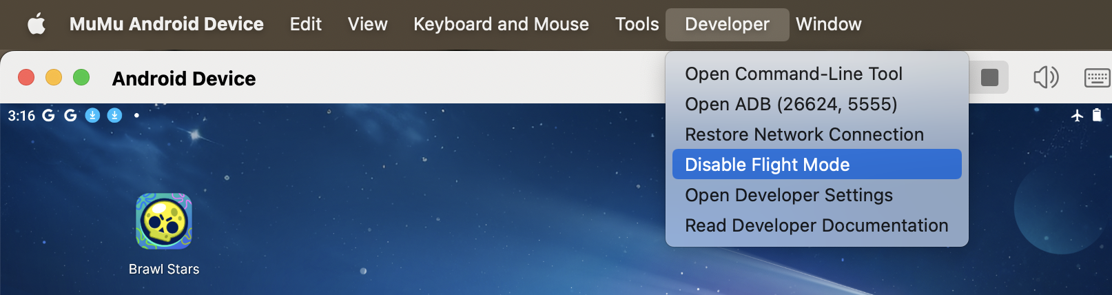 MuMuPlayer Pro supports to enable the flight mode of Android devices to assist developers in testing the performance of apps in flight mode.